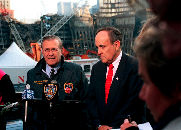 Rudy Giuliani (a destra), sindaco di New York, assieme al Segretario alla Difesa Donald Rumsfeld davanti alle rovine del World Trade Center, dopo l'11 settembre. Foto: Robert D. Ward, Public domain, via Wikimedia Commons